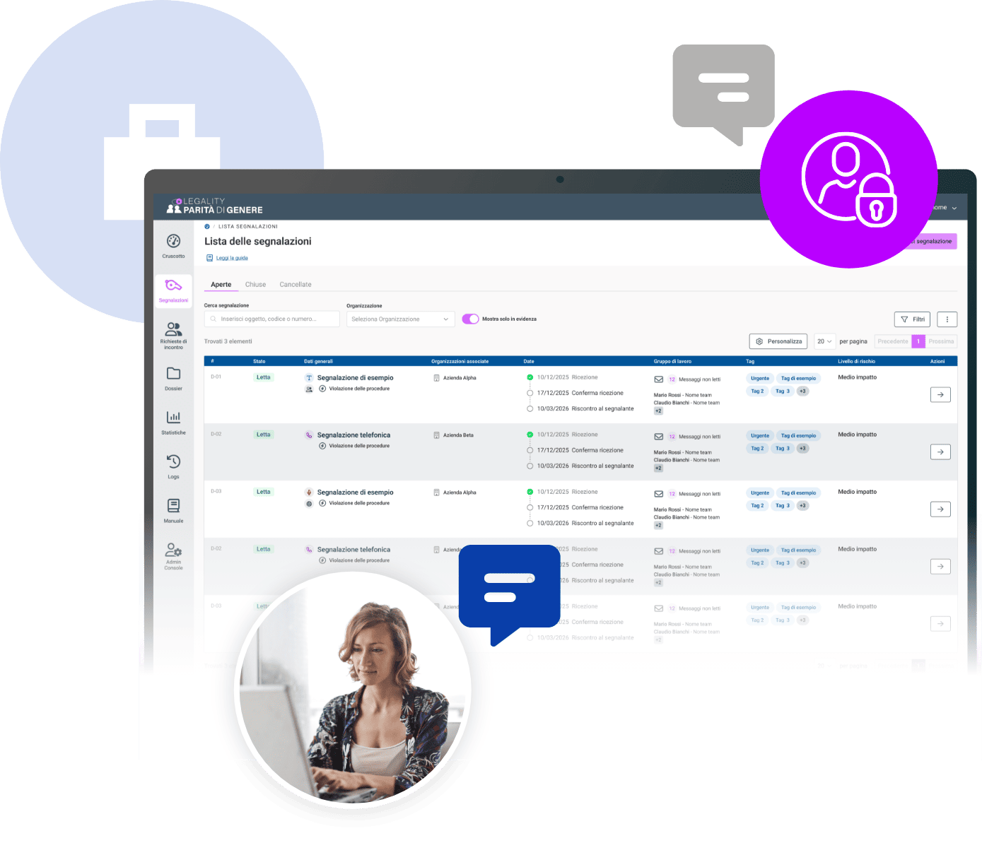 Legality Parità di Genere è la piattaforma progettata per gestire segnalazioni, non conformità e azioni correttive secondo i requisiti richiesti dalla prassi UNI/PdR 125:2022 — con un processo documentato dall’apertura del caso alla chiusura.